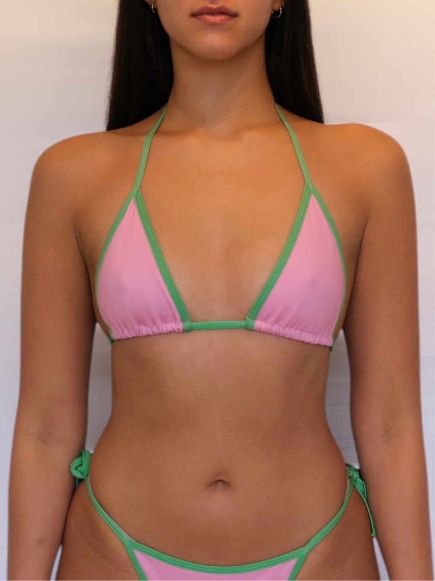 This playful set features two eye catching, contrasting colours. Designed with adjustable straps for a light and custom fit. The classic triangle top pairs effortlessly with the matching tie-side bottoms, making it your go-to choice for minimal tan lines.
